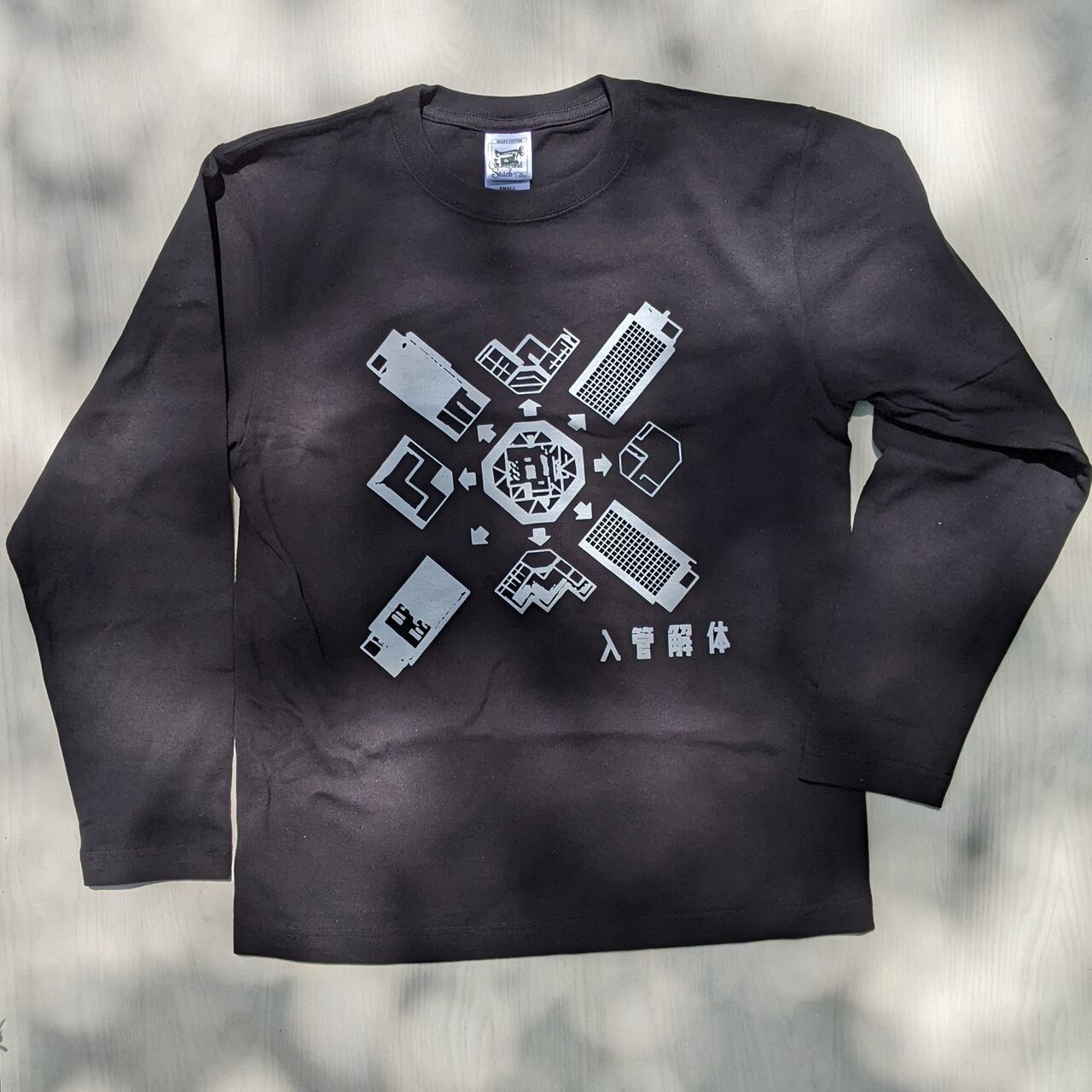上空から見た東京入管を解体する図案の長袖Tシャツです。ボディはCROSS & STITCHオープンエンドマックスウェイトロングスリーブTシャツ。しっかり厚手の長袖です。袖はリブ無し。プリント1箇所(胸)、耐久性に優れたシルクスクリーンプリント。