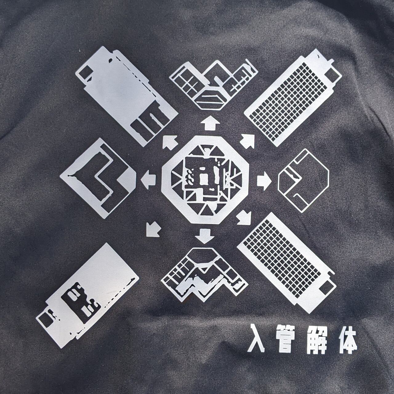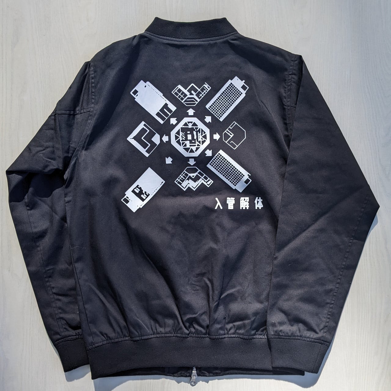 速乾性、耐久性に優れたT/Cウェザー生地(ポリエステル65%、綿35%)のスタジアムジャケットです。(United Athle品番7079)裏地付き、ファスナーはダブルスライダー仕様です。上空から見た東京入管の図案を左胸に、背中に解体した図案をプリントしました。耐久性に優れたシルクスクリーンプリント。